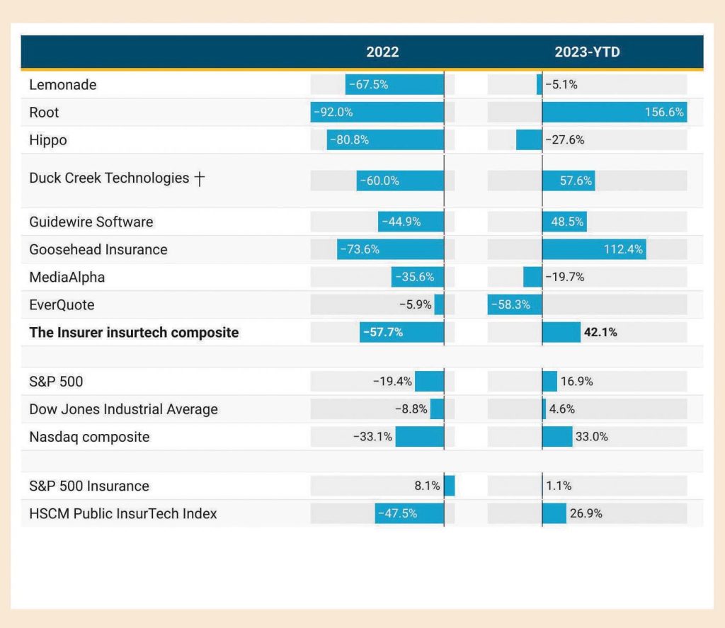 En su último día de negociación antes de ser excluida de la lista del Nasdaq a finales de marzo, las acciones de Duck Creek habían subido un 57,5% desde el último día de 2022. Mientras tanto, la insurtech automotriz EverQuote y Hippo fueron las dos caídas más significativas entre la composición en lo que va del año.